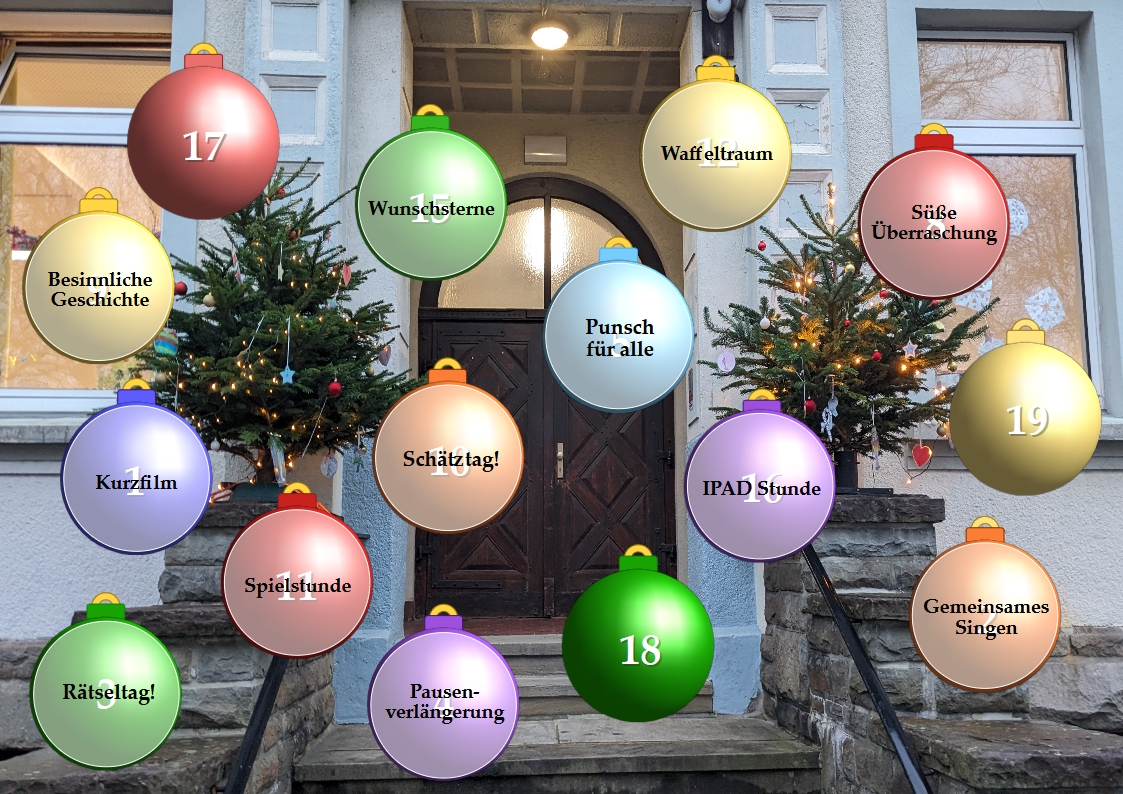 Auch in diesem Jahr halten wir mit unserem Adventskalender wieder an jedem Schultag im Dezember eine kleine Überraschung für unsere Schülerinnen und Schüler bereit.