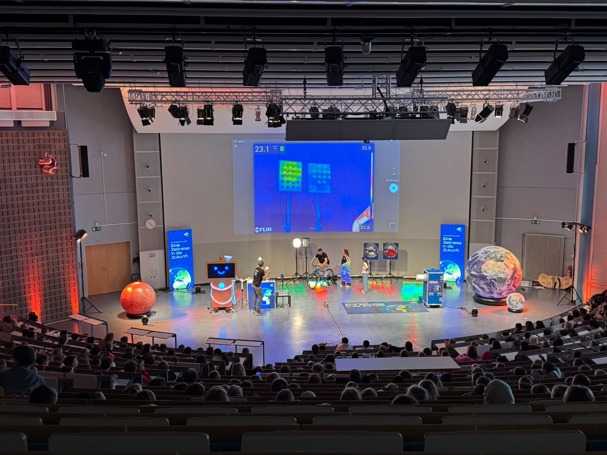 Eine Zeitreise in die Zukunft unternahm unsere Klasse 4 am Donnerstag, als sie einer Einladung zur Raumfahrt-Show des Deutschen Zentrums für Luft- und Raumfahrt DLR in die Technische Universität Dortmund folgte. Im großen Hörsaal, dem Audimax, trafen sie auf viele andere Schulklassen und erlebten eine rund 90-minütige Bühnenshow mit zahlreichen Live-Experimenten.